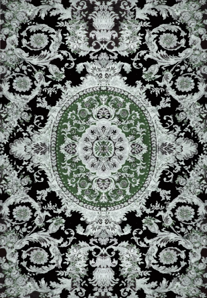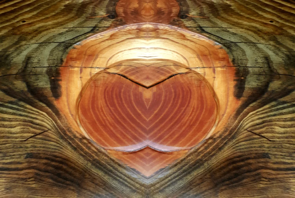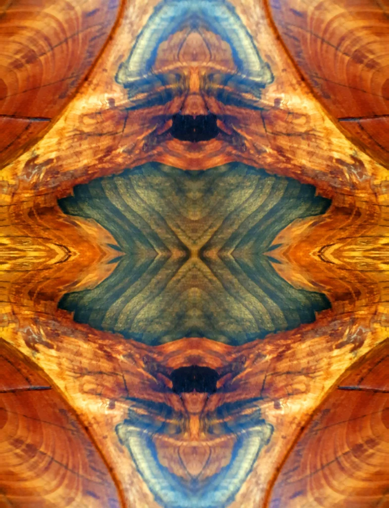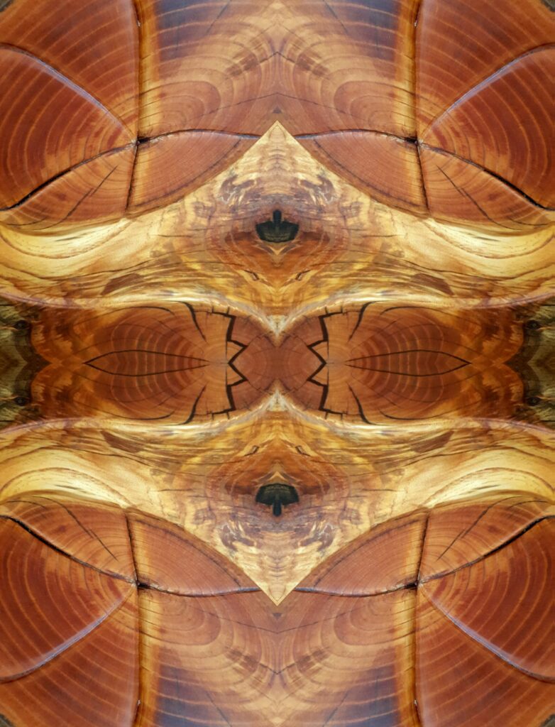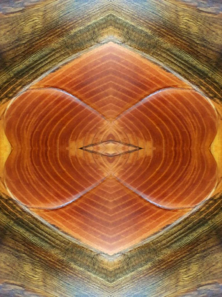 This is her latest series inspired by wood grain in an enormous slab of highly polished pine timber. As the tree grew the age rings produced an array of patterns colours and shapes. Golden or orange tones next to dark green a spectacular piece indeed.
